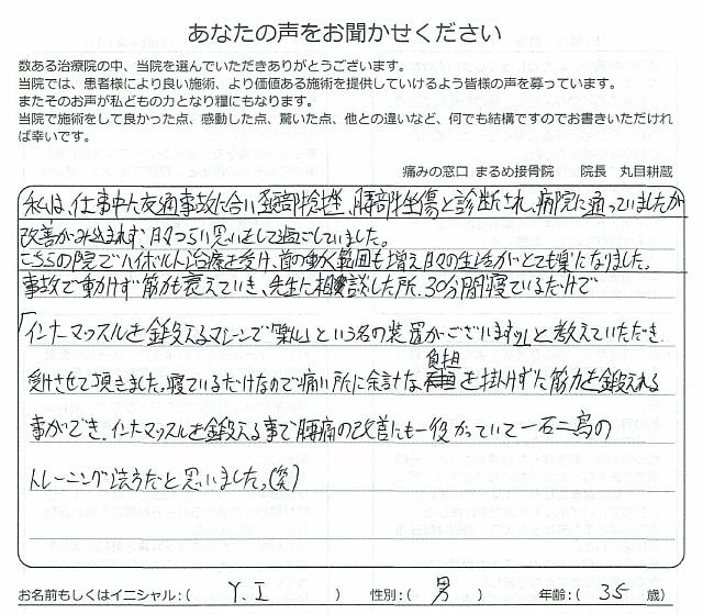 事故で動けず筋力も衰えていき、先生に相談した所、30分間寝ているだけで「インナーマッスルを鍛えるマシーンで楽トレという名の装置がございます」と教えていただき、受けさせて頂きました。
